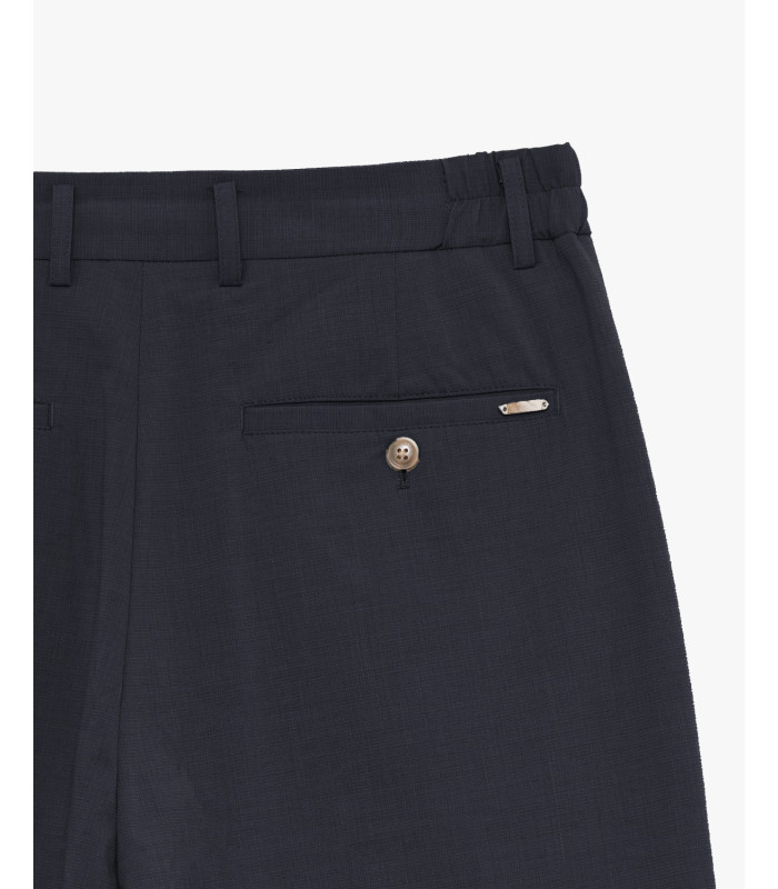 Waist with belt loops and elasticated back insert - front pleats - slanted front pockets - rear welt pocket with button - straight hem - logo patch.