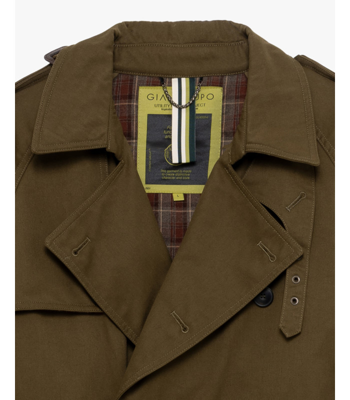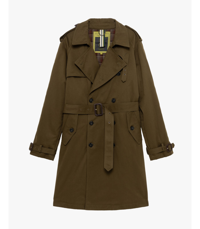 Shoulders with storm flap - belted waist with buckle - adjustable cuffs - flap pockets - back vent