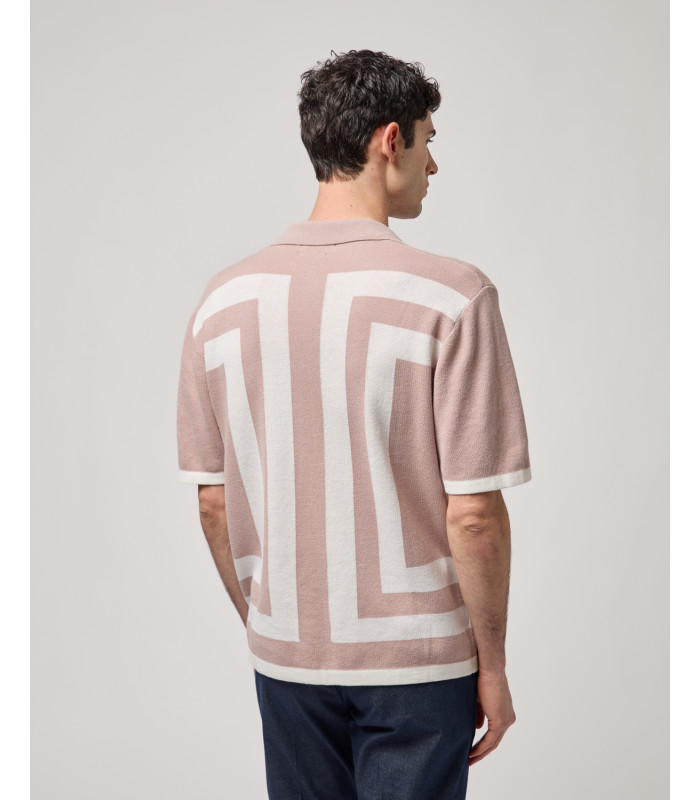 Short sleeves - open collar - front button fastening - compact knit construction - contrasting geometric pattern - ribbed hem and trims - logo patch at hem