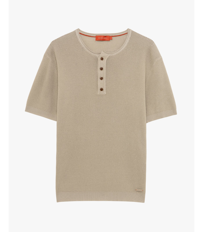 Collo serafino con bottoni - tessuto traforato - maniche corte - fondo e bordi rifiniti a costine - patch logo.